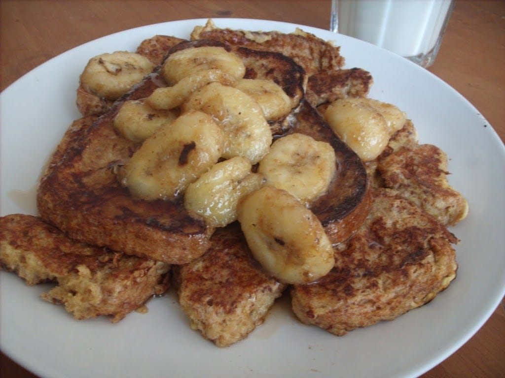 Note: You may notice that nutmeg and sugar are absent from my French toast batter. Nutmeg would be a great addition, but I don’t have any currently. As far as the sugar goes, I think there’s enough sweetness from the syrup and bananas that you don’t really need it. If you want, you can try using almond extract or amaretto instead of vanilla extract for a slightly different taste.