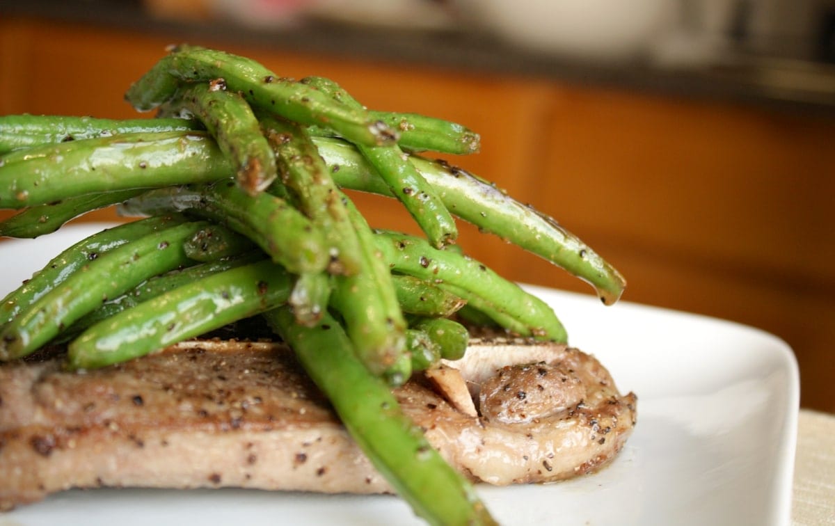 2. In a roasting pan, drizzle the green beans with olive oil and season with salt, pepper, and garlic powder; toss to coat; place in oven and cook for about 15 minutes so that the beans still have some crunch, but have started to brown slightly.