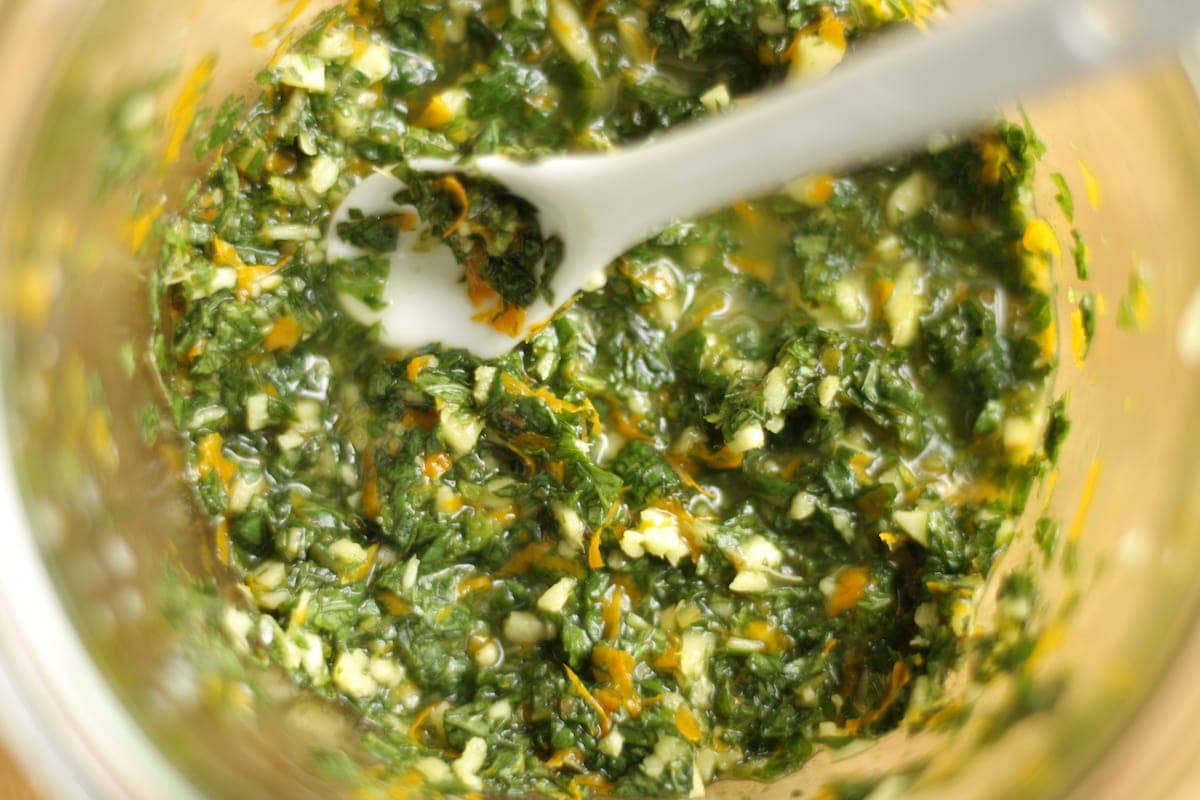 One note about this recipe is that roasting thinly sliced ginger with the carrots and onions is optional because it ends up getting charred (a.k.a. burnt). There’s plenty of ginger flavor provided by the fresh mint sauce served with the soup if you wish to omit it in the soup base, or you can leave the ginger in larger chunks for roasting. (More on the mint ginger orange sauce below.) Of course I left the charred ginger in and blended it with everything else—I like a bit of char—but I’ll leave that decision up to you.